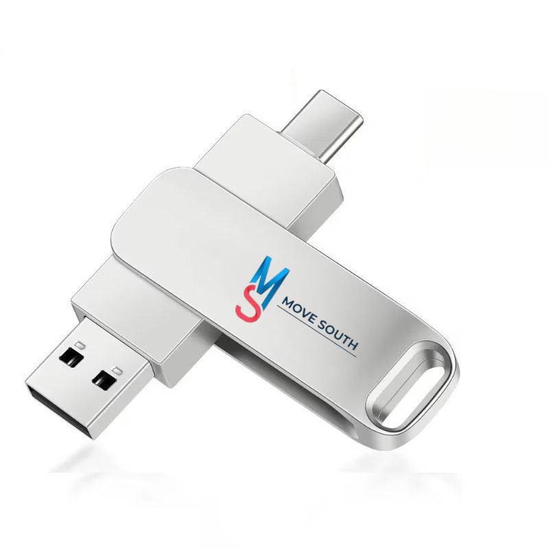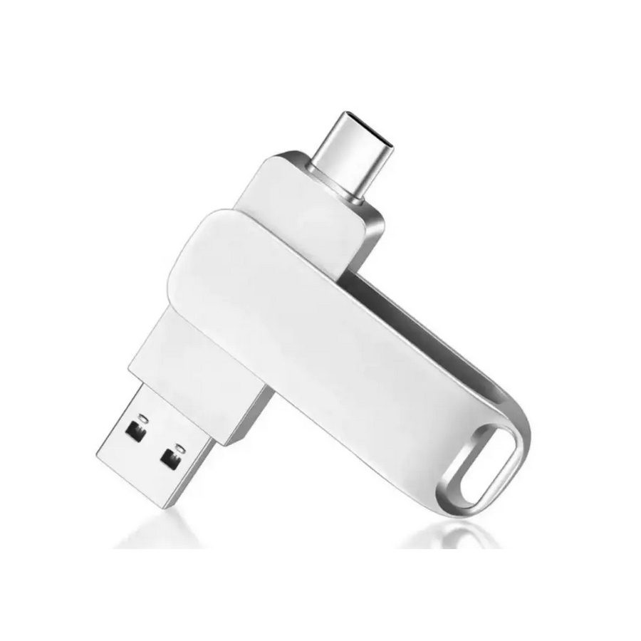 Une clé USB pratique combinant une prise USB 2.0 et USB C pour faciliter vos transferts de données. Pivot en argent ou coloré. Dimensions: 72 x 20 x 10 mm (2.83" x 0.79" x 0.39").
