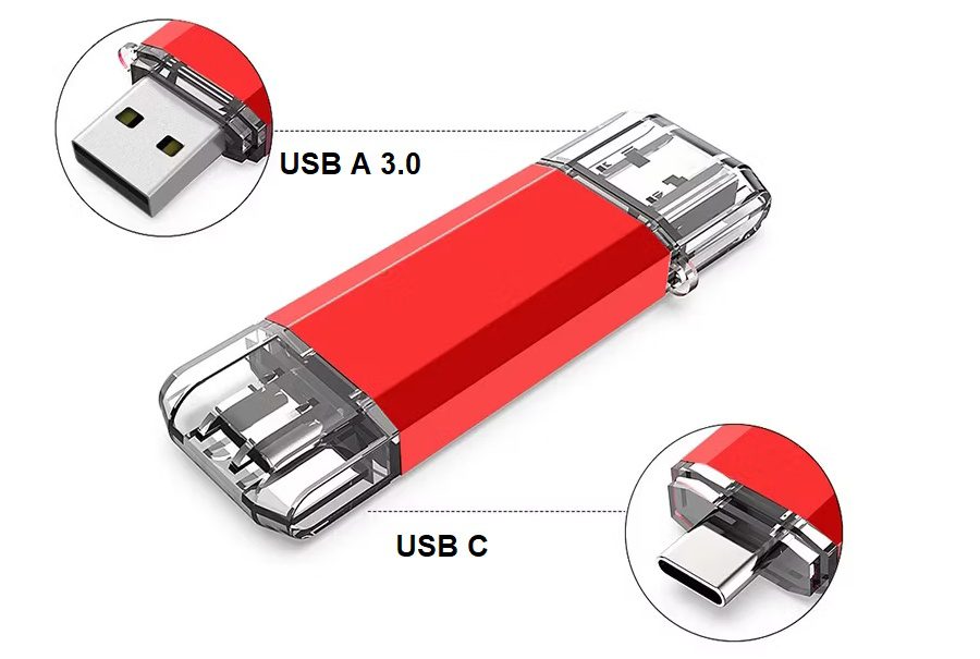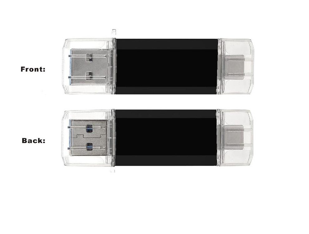 Élégante clé USB 3.0 OTG en métal que augmente de stockage externe et facilite le transfert de fichiers, photos, vidéos. Un côté est USB A 3.0 et l'autre est Type C. Dimension: 65 x 16 x 9.1 mm (2.56" x 0.63" x 0.36").