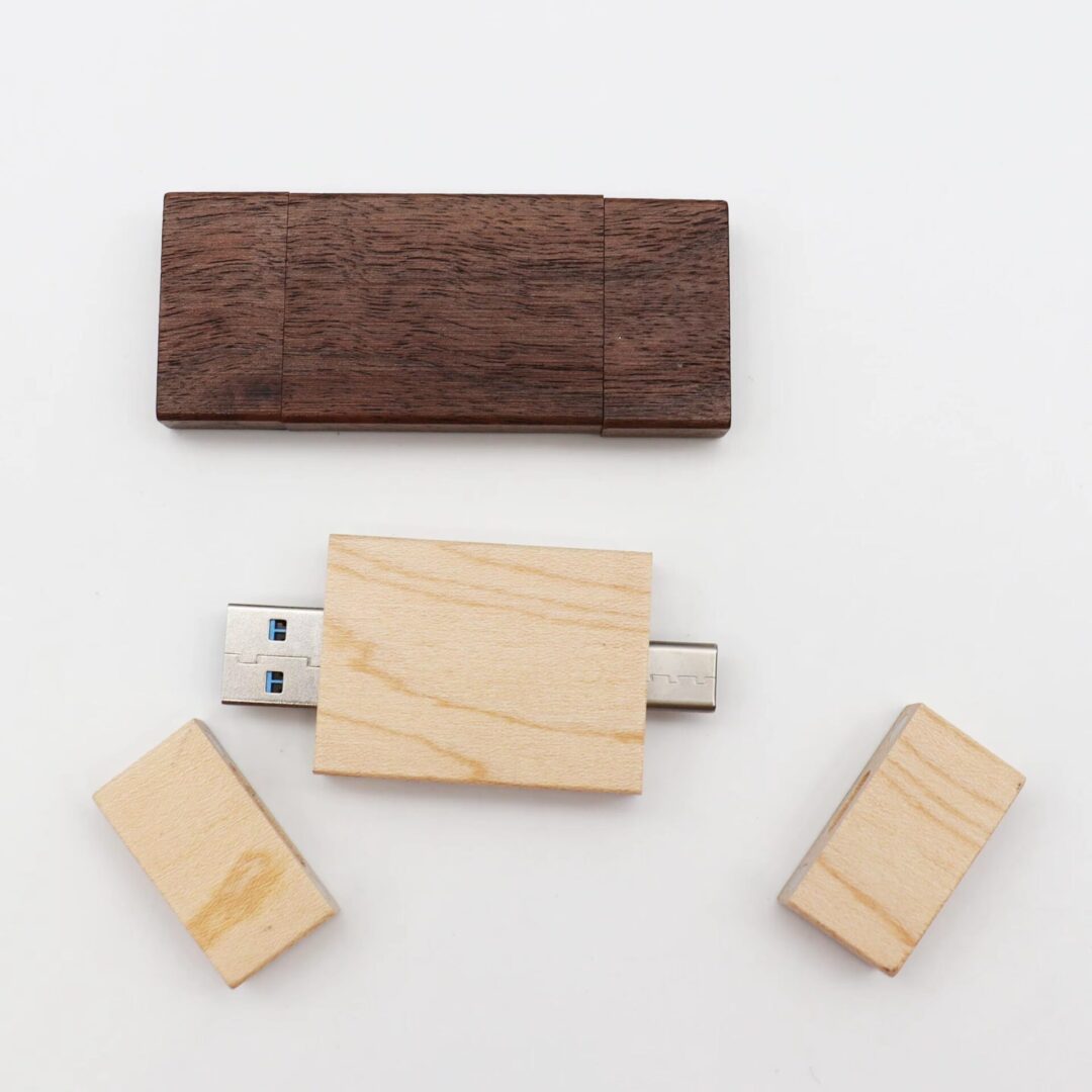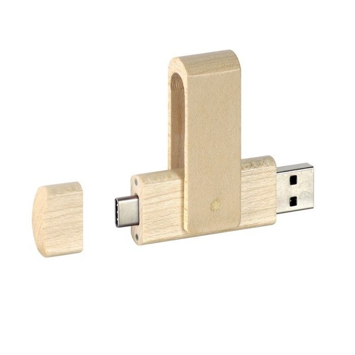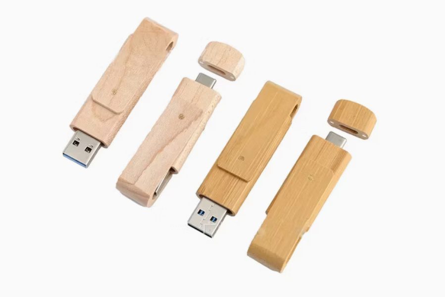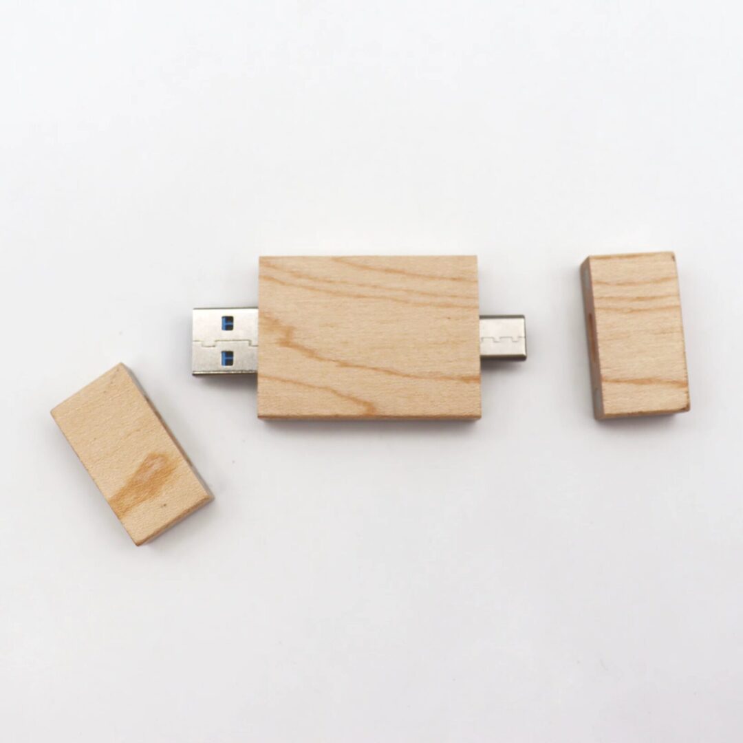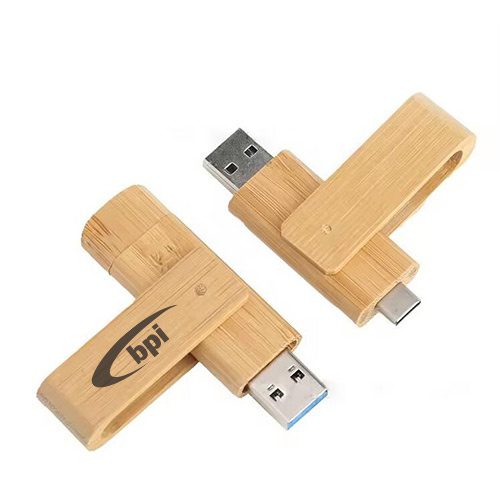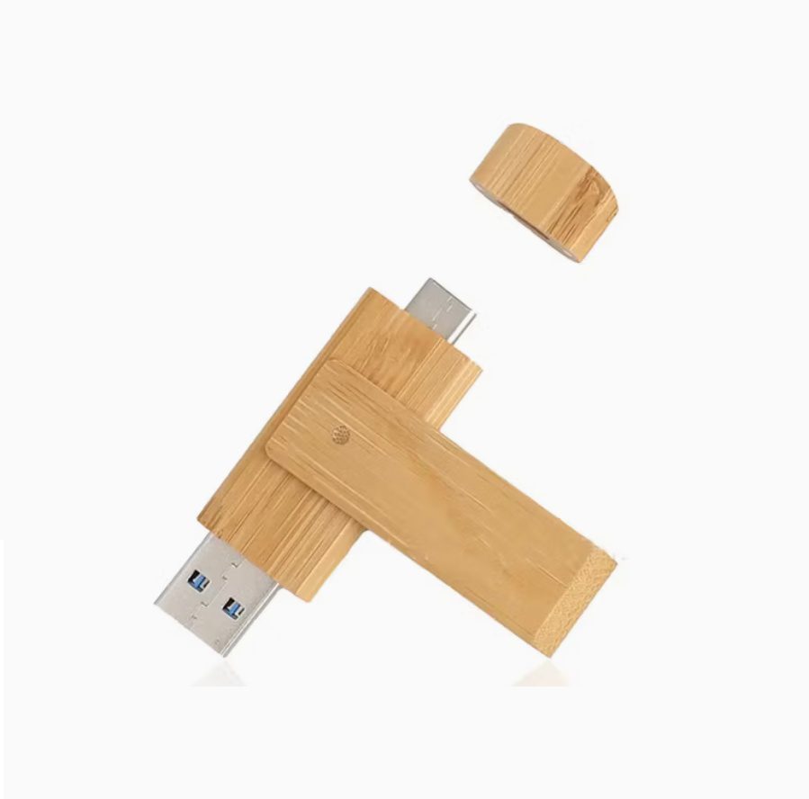 Clé USB pivotante unique en bambou ou en bois, dotée de deux connecteurs — Type‑C et Type‑A — pour une utilisation polyvalente. Conçue pour offrir des performances haute vitesse et une capacité de stockage complète, elle allie fonctionnalité et style écoresponsable. Dimensions: 72 x 19 x 11 mm (2.84″ x 0.75″ x 0.43″).